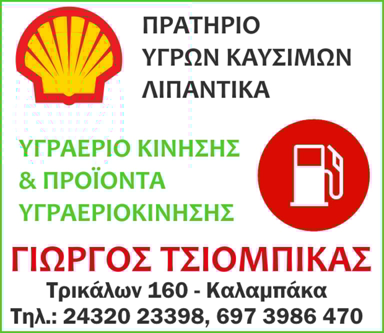 Το πρατήριο υγρών καυσίμων SHELL (Τσιομπίκας Γεώργιος) στην Καλαμπάκα προσφέρει καύσιμα (5Χ20lit).