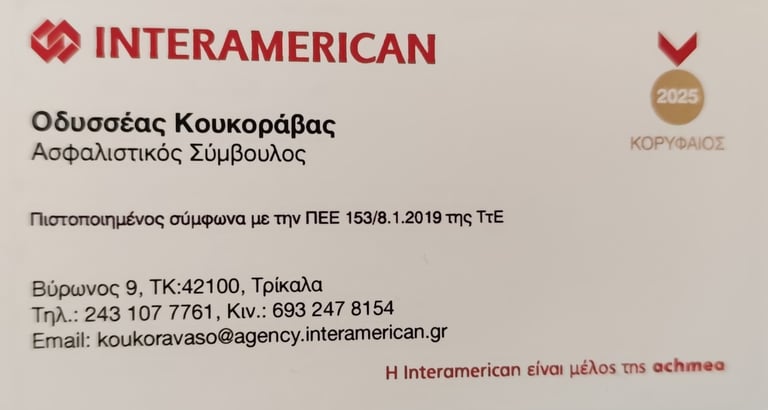 Το υποκατάστημα Τρικάλων INTERAMERICAN Οδυσσέας Κουκοράβας - Μπαμπαλίτσα Τριανταφυλλιά προσφέρει μια ετήσια ασφάλιση μοτοσυκλέτας (Basic πακέτο).