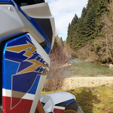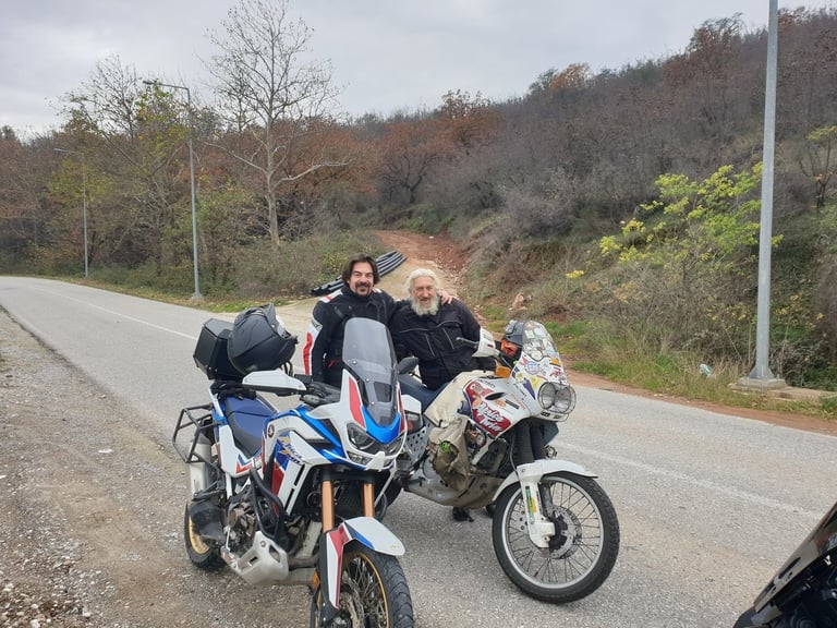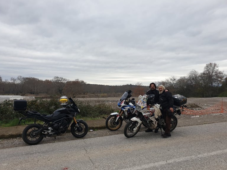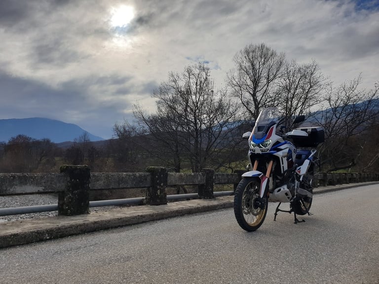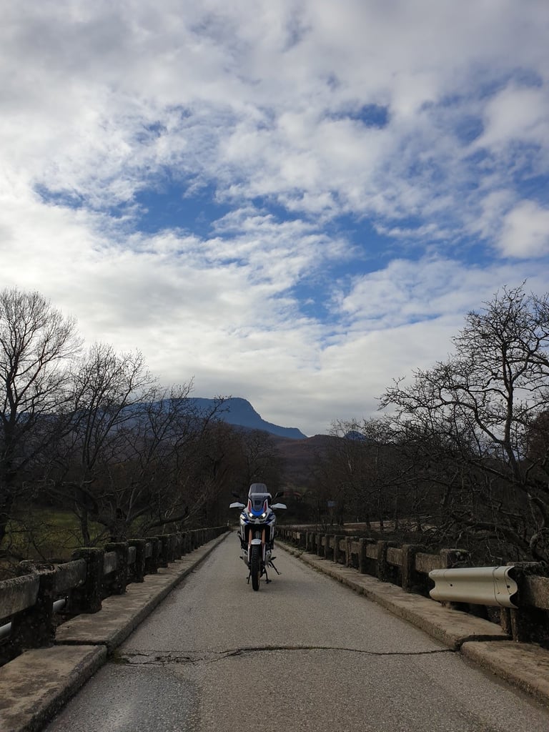 Φτάνοντας στη στενή γέφυρα στο Μουργκάνι, το τοπίο αρχίζει να αγριεύει. Είναι το σημείο που λες «τώρα μπαίνουμε στα δύσκολα». Εκεί, σε μια τυχαία στάση για ένα τσιγάρο, το σκηνικό απέκτησε "Old School" αίγλη. Από το πουθενά εμφανίστηκε ο Αντώνης με την θρυλική του Africa Twin 750 — μια μηχανή που μοιάζει να έχει γεννηθεί γι’ αυτά τα βουνά.