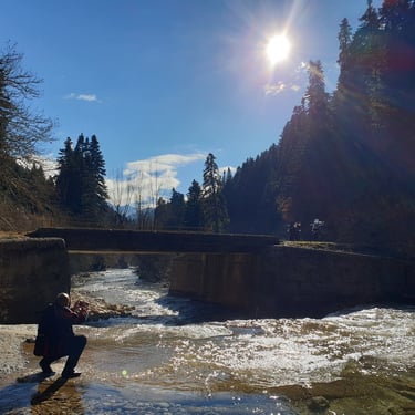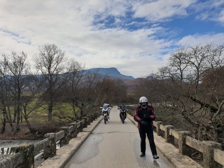 Σε αυτό το κομμάτι, η οδήγηση γίνεται μαγεία. Δεξιά σου το ποτάμι, αριστερά σου οι απόκρημνες πλαγιές και μπροστά σου μια άσφαλτος που γυαλίζει από την υγρασία. Περνώντας τα πέτρινα γεφύρια, νιώθεις ότι ο χρόνος έχει σταματήσει κάπου στη δεκαετία του '50. Η κίνηση μηδενική – μόνο εμείς, οι μηχανές μας και η ανάσα του βουνού. Όσο πλησιάζαμε στη διασταύρωση για το Χαλίκι, το λευκό στις κορυφές Κακαρδίτσα και Περιστέρι δεν ήταν πια μια μακρινή εικόνα, αλλά μια πραγματικότητα που μας περίμενε.
