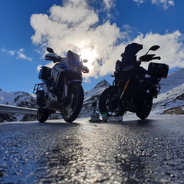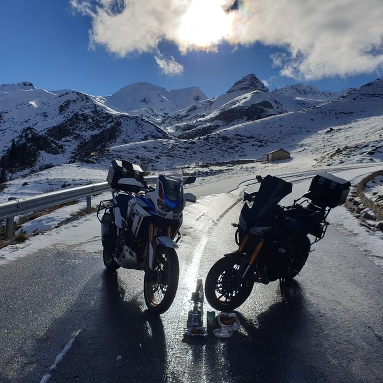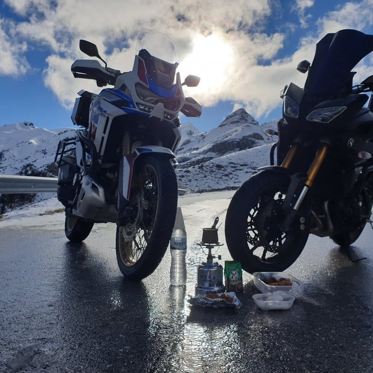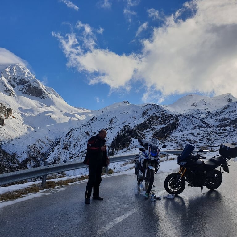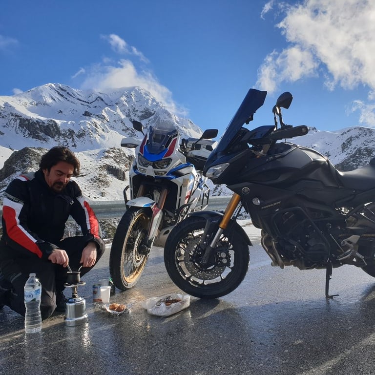 Ξεκινήσαμε, λοιπόν, όχι γιατί ήμασταν σίγουροι ότι θα φτάσουμε, αλλά γιατί η ίδια η προσπάθεια είναι που μετράει. Φορτώσαμε την Africa Twin και το Tracer, βάλαμε στις αποσκευές τα απαραίτητα "εφόδια" —από εργαλεία (λέμε τωρα !) μέχρι τα μελομακάρονα και τα κεφτεδάκια της Μαρτίνας— και βγήκαμε στον δρόμο. Μια βόλτα που ξεκίνησε για δύο, μας χάρισε μια τυχαία συνάντηση με τον Αντώνη που μας θύμισε την ομορφιά της μοτοσυκλετιστικής παρέας, και κατέληξε σε μια ιεροτελεστία πάνω στο χιόνι. Γιατί τελικά, ο καφές έχει άλλη γεύση όταν τον πιεις εκεί που ο δρόμος σταματά και αρχίζει ο ουρανός.