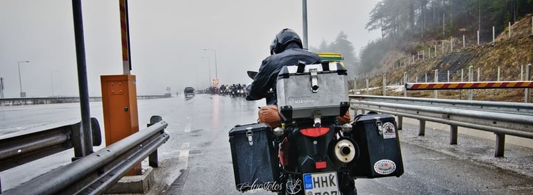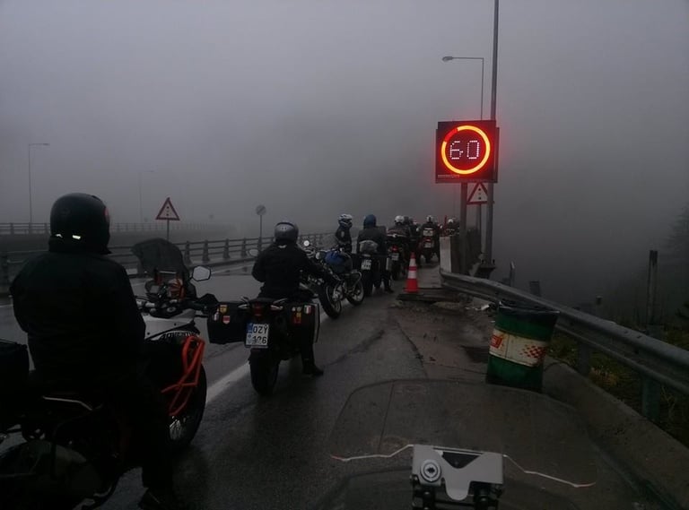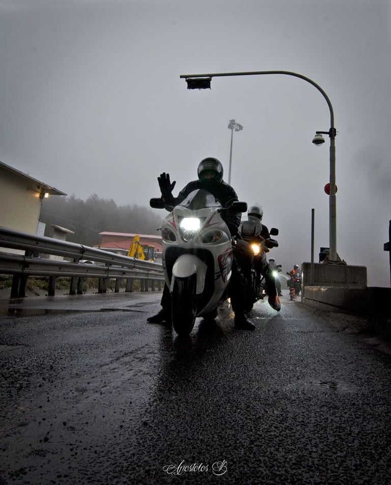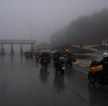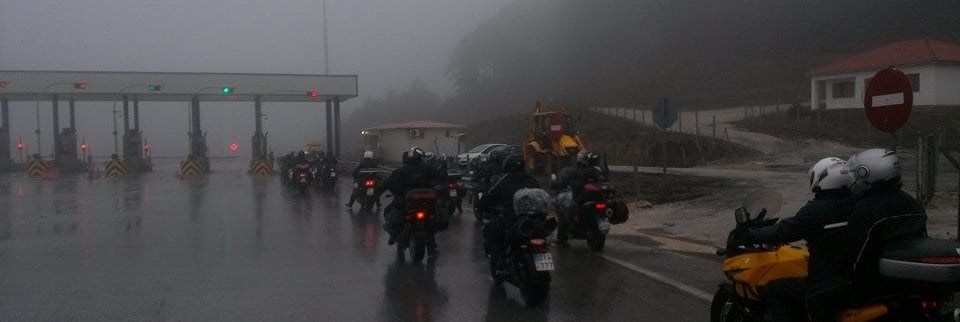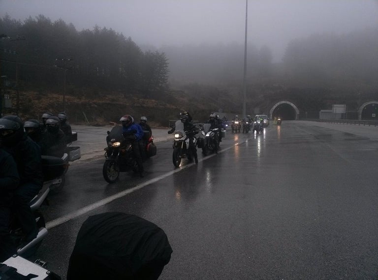 Περάσαμε από την Τρυγώνα και την Ανάληψη (Βασίλη, στην επόμενη θα είσαι οπωσδήποτε μαζί μας στο γκρουπ!) και κάναμε ένα γρήγορο regroup μετά το Μαλακάσι, ακριβώς πριν την είσοδο στην Εγνατία Οδό. Η ατμόσφαιρα είχε πλέον αλλάξει δραματικά. Η βροχή είχε δυναμώσει, το κρύο άρχισε να τρυπάει τα αδιάβροχα και η ομίχλη έκανε την εμφάνισή της λίγο πριν τα διόδια, περιορίζοντας την ορατότητα και το ηθικό μας.