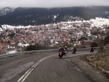 Υπήρχε φόβος για παγετό, αν και είχε μεσημεριάσει πια. Το ύψος του χιονιού δεξιά και αριστερά του δρόμου όσο σκαρφαλώναμε στο Εθνικό Πάρκο της Πίνδου ανέβαινε. Η θερμοκρασία από την αντίθετη έπεφτε. Θυμάμαι που ρώτησα τον Αποστόλη κάποια στιγμή και μου είπε πως το θερμόμετρο της εξωτερικής θερμοκρασίας της μοτοσυκλέτας του έδειχνε 7 βαθμούς....