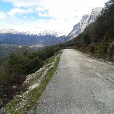 Το βλέμμα μου αρχίζει να «καταπίνει» λαίμαργα τα πρώτα μέτρα, τις πρώτες στροφές πίσω μου, μέχρι που χάνεται στον δρόμο που διασχίζει τη ραχοκοκαλιά του βουνού.