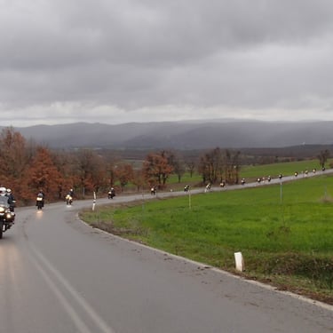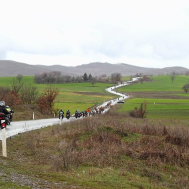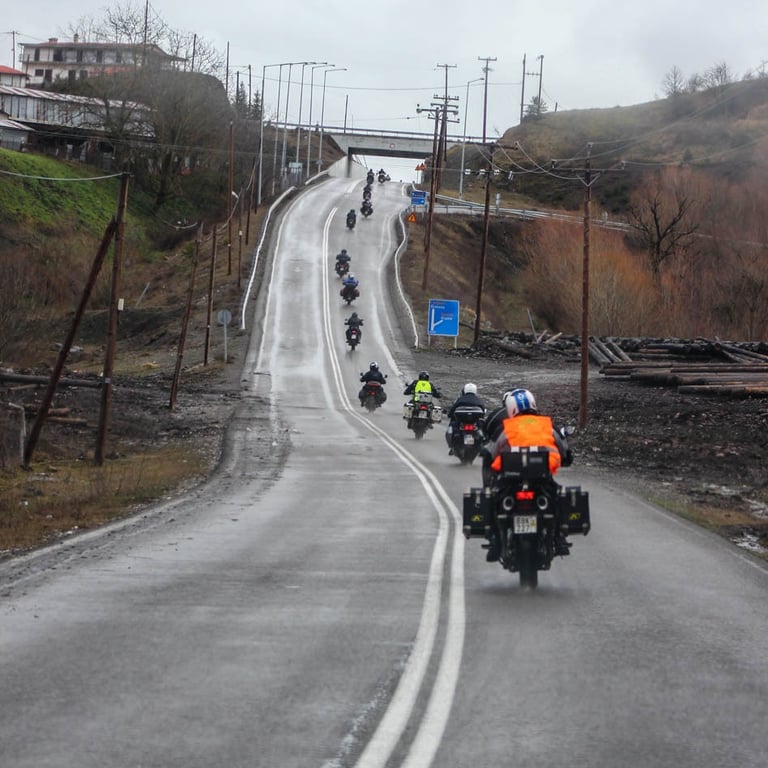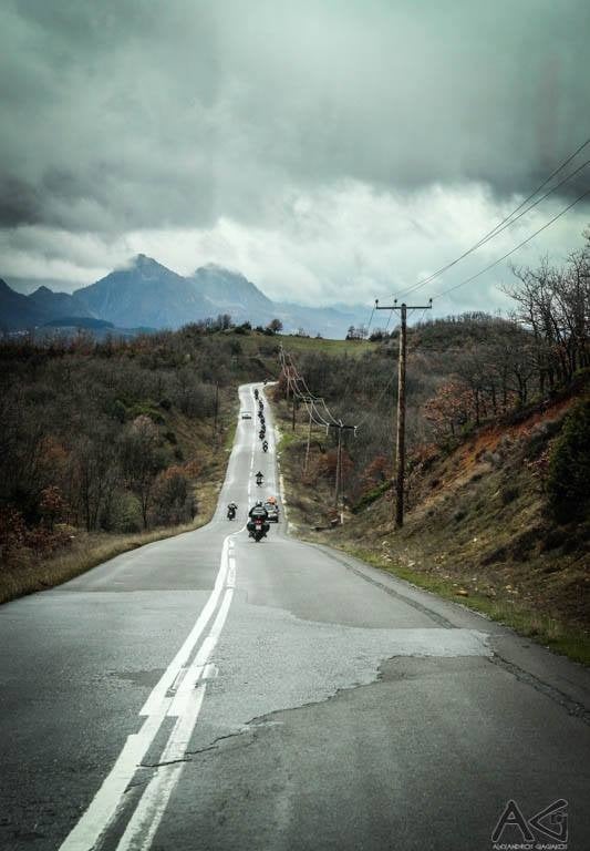 Είχαμε σημαδέψει αυτό ακριβώς το σημείο για μια στάση για φωτογραφίες και τσιγάρο κατά τη διάρκεια της επερχόμενης οδύσσειας — μια ευκαιρία για 179 αναβάτες να απορροφήσουν τη μεγαλοπρέπεια της οροσειράς της Πίνδου. Δυστυχώς, όπως σύντομα θα ανακαλύπταμε, τα βουνά είχαν ένα διαφορετικό πρόγραμμα για εμάς. Όταν ήρθε η πραγματική μέρα, η βροχή και το τσουχτερό κρύο μετέτρεψαν αυτό το «photo-op» σε μια μάχη αντοχής, αναγκάζοντάς μας να συνεχίσουμε να κινούμαστε.