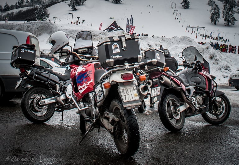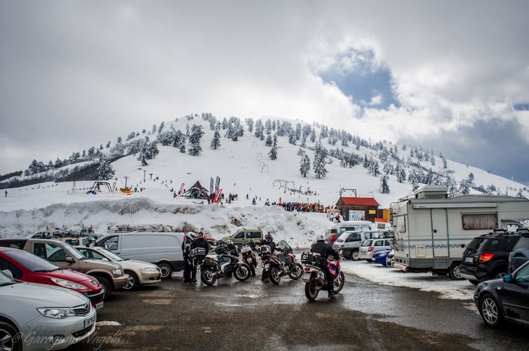 Στάση στις κάτω πίστες του χιονοδρομικού της Βασιλίτσας και εκεί πλέον αντιλαμβάνομαι τον όγκο της εκδήλωσης. Παρκαρισμένες μοτοσυκλέτες μέχρι εκεί που έφτανε το μάτι μου. Σαστισμένοι οι σκιέρ είχαν σταματήσει και μας κοίταζαν. Μην μας λυπάστε παιδιά, ίσως τα δικά μας ρούχα να είναι πιο ζεστά από τα δικά σας ;)