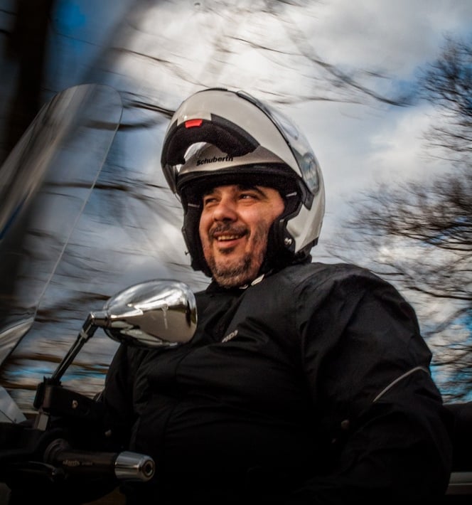 Ένας άνθρωπος με μόνιμο χαμόγελο και ανεβασμένη διάθεση, οπλισμένος με ένα «κρύο» χιούμορ που αναγκαζόμαστε να υπομένουμε μόνο και μόνο για να έχουμε το κεφάλι μας ήσυχο. Είναι ο στρατηγός της παρέας, ικανός να συζητά για ώρες κάθε λεπτομέρεια της επόμενης διαδρομής μας. Έχει μια αυστηρή πολιτική «χωρίς σύνορα», μοιράζει την πίστη του ανάμεσα στην KTM και την BMW, και διαθέτει μια τρομακτική δύναμη πειθούς.