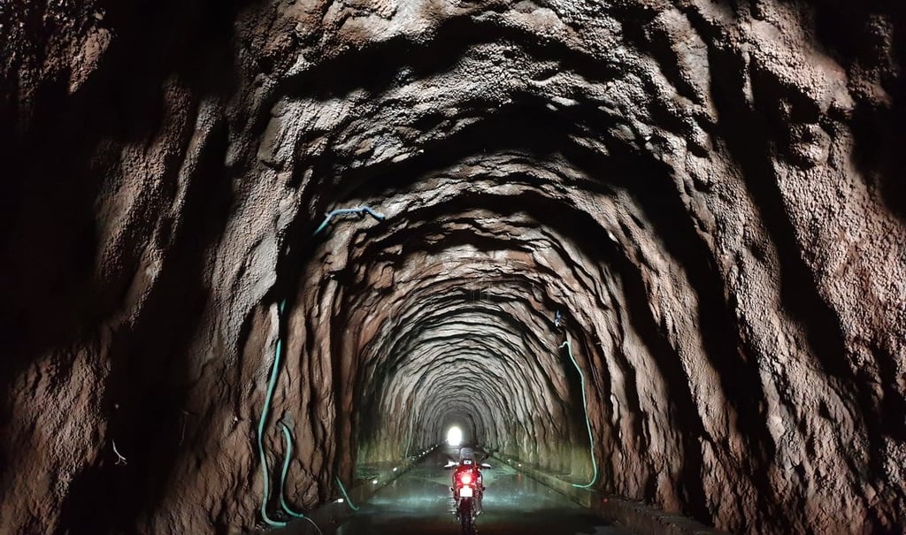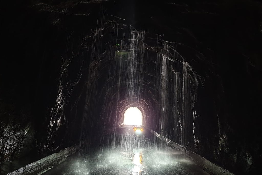 Inside, the transition is a physical blow. You leave the open air and are swallowed by raw, hand-gouged stone. There is no concrete lining here—the work stopped before the mountain could be tamed. It is a place of perpetual twilight, lit only by the violent red flicker of our taillights and the cold, piercing white of our LEDs.