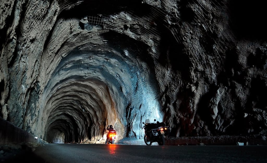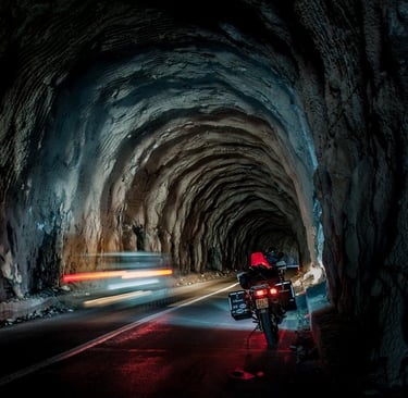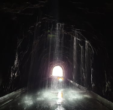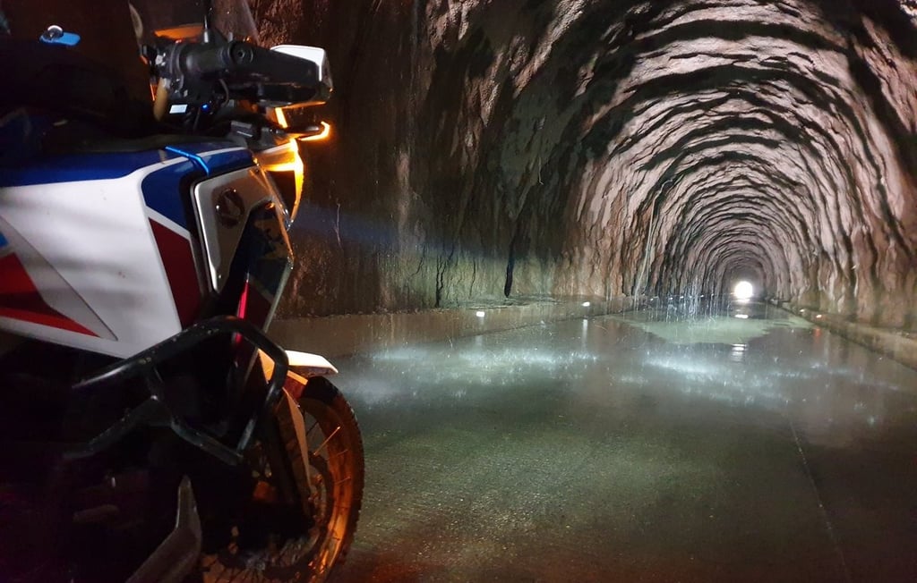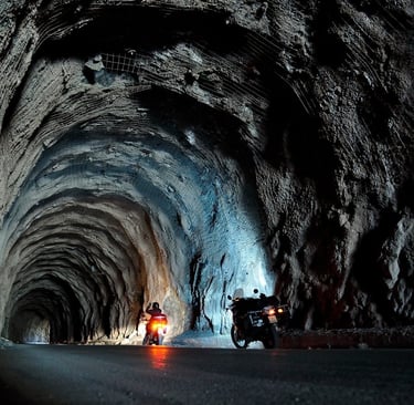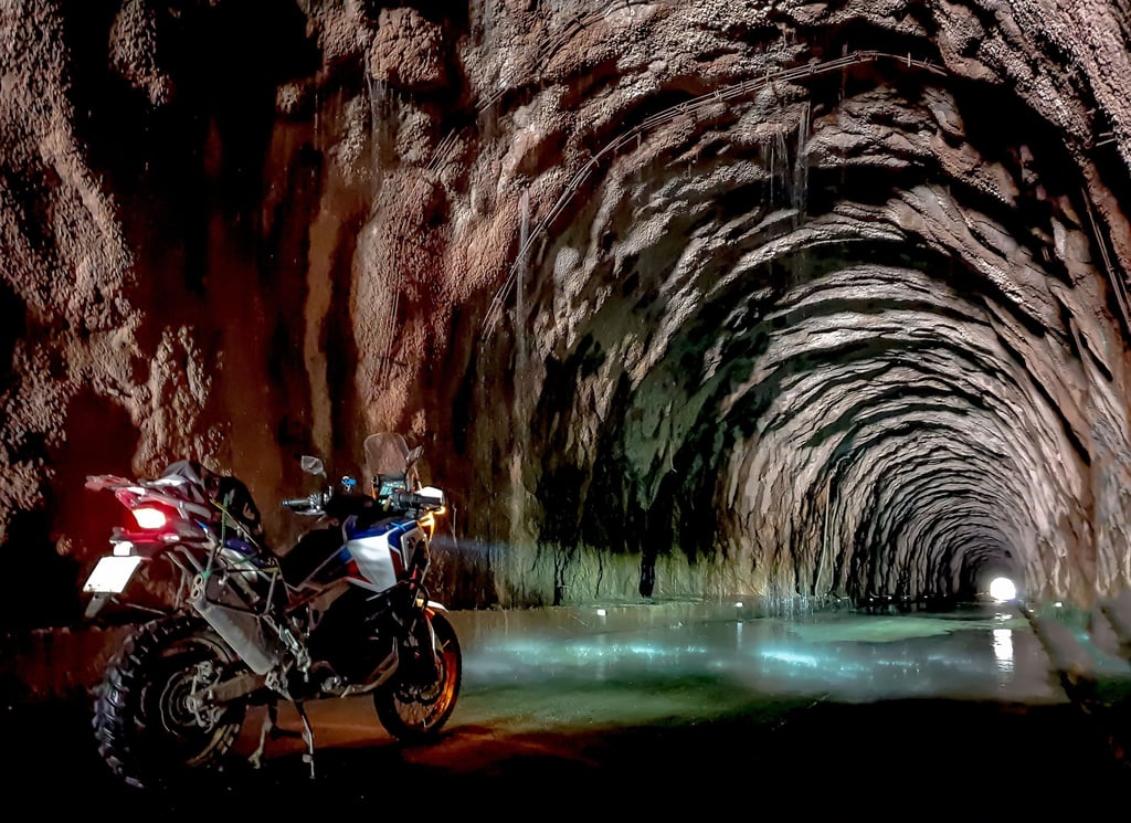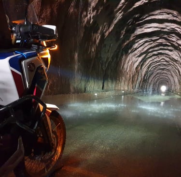 Then comes the sound. It starts as a low hiss and grows into a roar. The rain that drips from the roof of the tunnel is the mountain slowly weeping into the unfinished void. It falls in heavy, shimmering curtains, drenching our gear and turning the tunnel floor into a black mirror that reflects the mechanical skeletons of our bikes. In the Throat of the Devil, you don't just ride; you submerge into a ghost of industrial ambition.