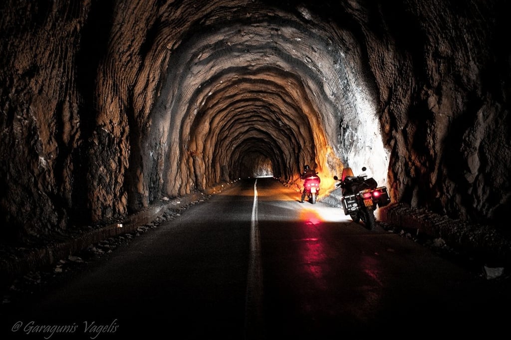 Apostolis brought the thunder(?) of the Aprilia Caponord 1000, its V-twin roar destined to echo off the raw, hand-carved walls of the Sykia Tunnels.