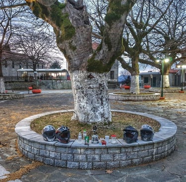 As the sun dipped behind the jagged peaks, we finally found refuge in the Anthiro Village Square. We parked beneath the massive, skeletal branches of ancient plane trees. The village was silent, its stone houses watching us like blind eyes from a forgotten era.