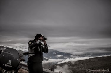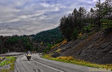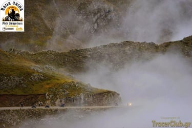 After a final regroup on the old Ioannina-Trikala national road, we began the descent toward Anilio. We crossed over and under the massive Egnatia highway, diving back into one of the most beautiful asphalt 'trails' toward Chaliki. By then, the night had begun to spread its velvet veils, and as we reached the mountain pass, the darkness grew thick and heavy.
