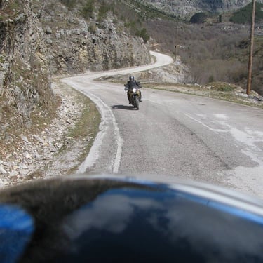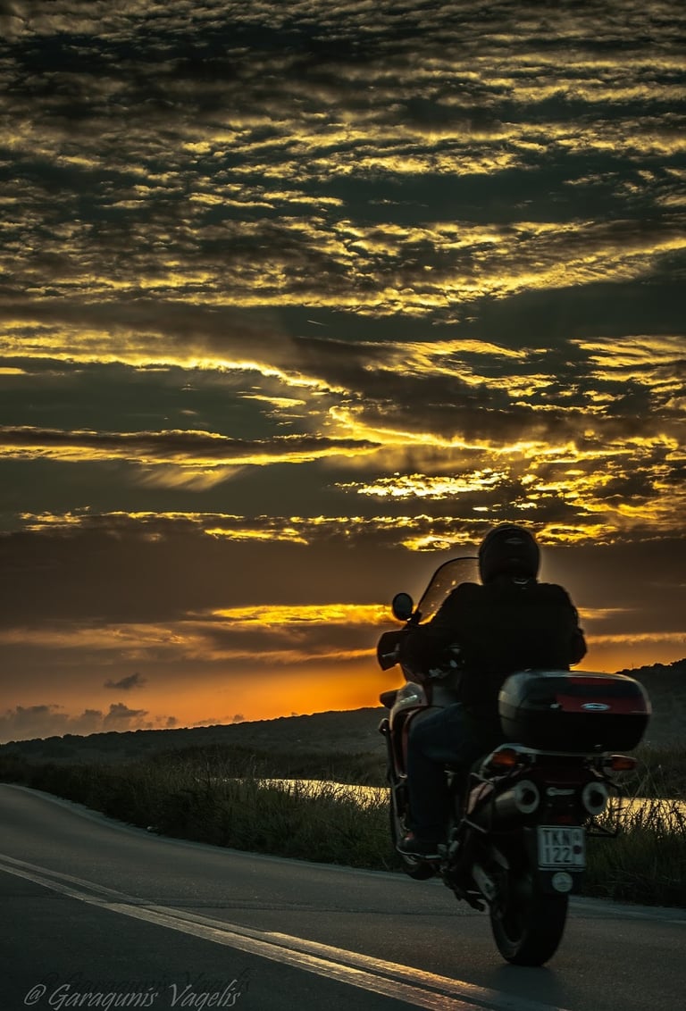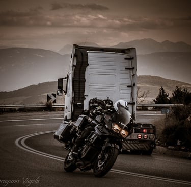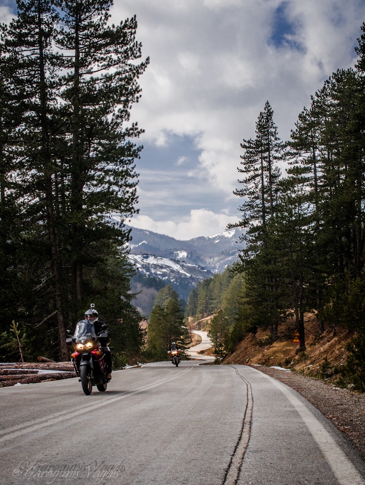 For several kilometers, my eyes travel along the ribbon of yellow and white light formed by dozens of motorcycles. All the way to the very last bend, I can see the dance of these two-wheeled beauties upon the stage of the Epirus mountains. A dance that is slow, languid, almost erotic...